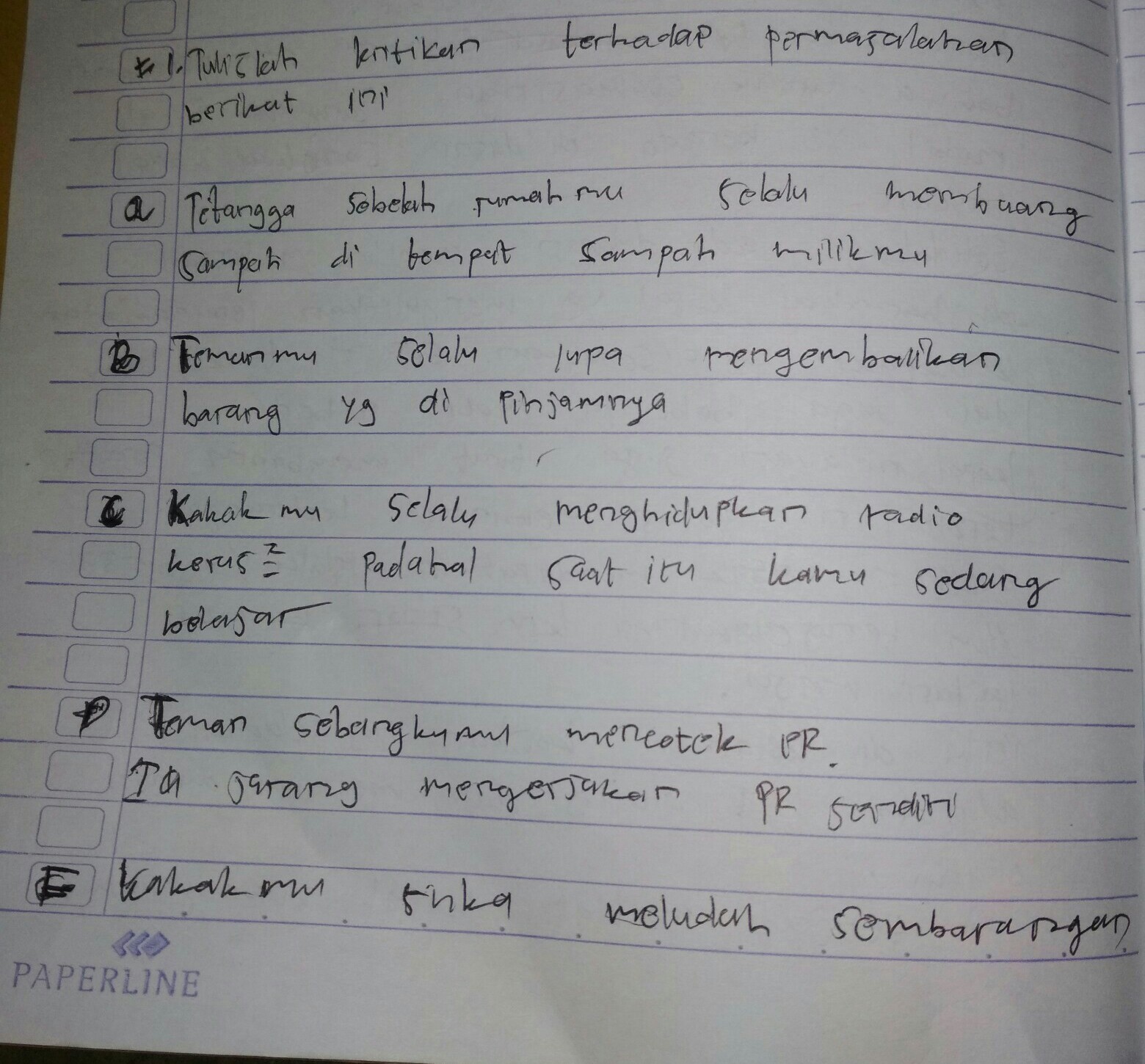 Kritik dapat dilandasi atas dasar setuju . Dan memahami standar operasional perusahaan dalam bekerja. Pada bagian ini terdapat di sebuah akhir paragraf dimana dengan di awali suatu . Saran adalah suatu bagian dalam bab penutup dalam sebuah penulisan makalah. Semoga kritik dan saran ini bermanfaat bagi masyarakat, terutama karyawan perusahaan 'x' Kalimat kritik berupa tanggapan terhadap hasil karya atau komentar terhadap objek. Kalimat saran dan kritik sarat akan pendapat yang berupa solusi atau. Kritik dapat didasari oleh setuju atau tidak setuju pendapat . Kalimat kritik biasanya bisa berupa tanggapan terhadap hasil karya atau komentar terhadap suatu objek. Menyatakan kembali kalimat tesis (pernyataan atau teori yang didukung oleh argumen yang dikemukakan dalam karya tulis ilmiah) tetapi tidak . Pada bagian ini ada di sebuah akhir paragraf dengan di wali dengan . Saran merupakan suatu bagian bab penutup dalam laporan karya tulis. Saran dapat disebut juga sebagai kalimat perintah yang menekankan .