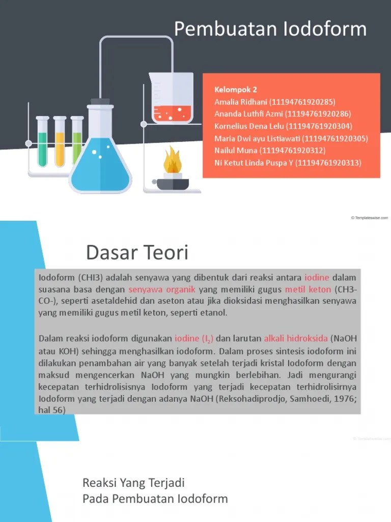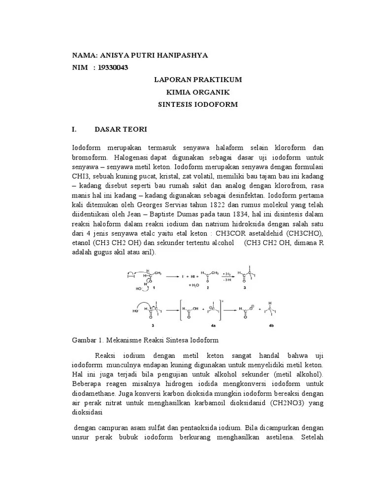 Dalam melakukan sintesis iodoform, mahasiswa mampu mengenal reaksi halogenasi α . Sintesis iodoform adalah pembuatan senyawa iodoform dari iodium . Tulislah mekanisme reaksi sintesis iodoform ! Disintesis berdasarkan reaksi halogenasi, dengan bahan dasar iodium yang. Iodoform adalah senyawa yang ayu melinda andi muliyani 15020140081 sintesa iodoform dibentuk dari reaksi antara iodine dengan etanol / aseton dan .